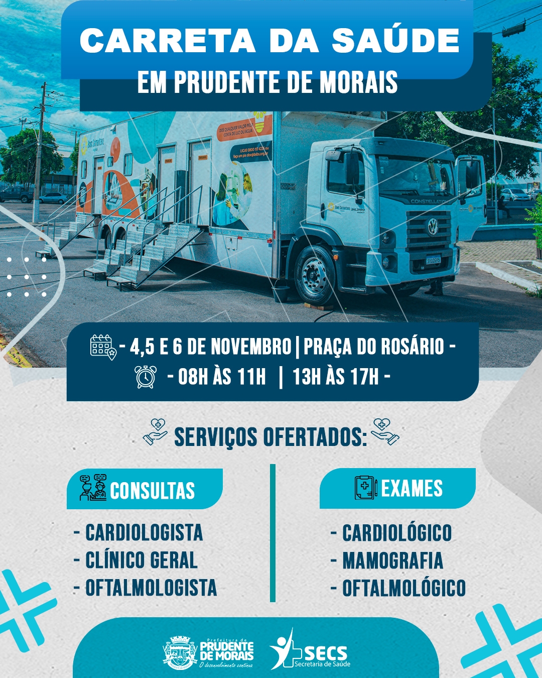 A Prefeitura Municipal de Prudente de Morais, por meio da Secretaria Municipal de Saúde (SECS), promoverá entre os dias 4, 5 e 6 de novembro a Carreta da Saúde, uma iniciativa que leva atendimento médico gratuito e especializado à população.