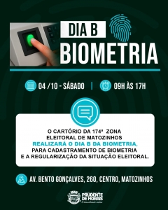 No próximo sábado, 04 de outubro, o Cartório Eleitoral da 174ª Zona Eleitoral de Matozinhos realizará o Dia B da Biometria, dedicado ao cadastramento e à regularização eleitoral de cidadãos que ainda não coletaram seus dados biométricos.