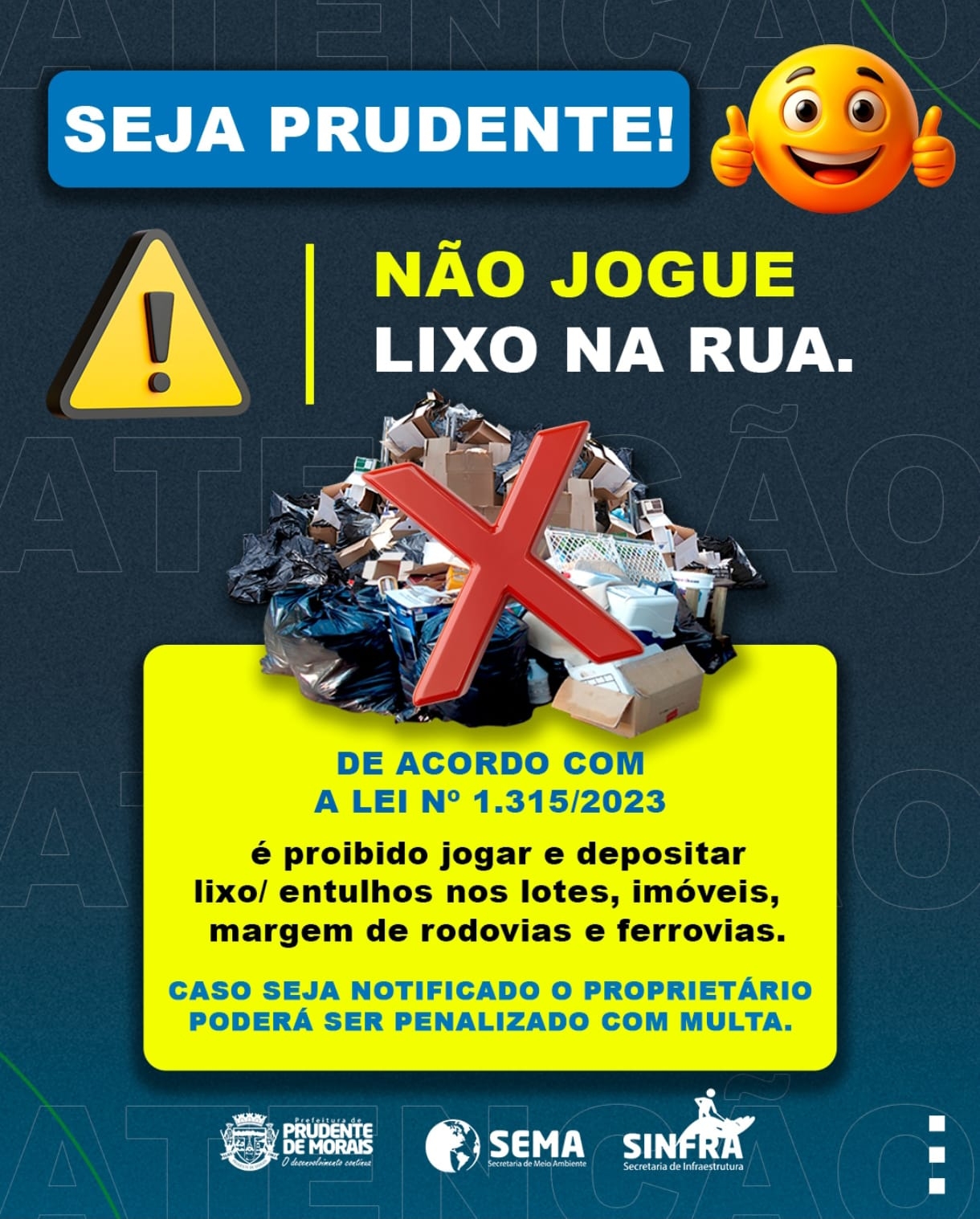 Com o objetivo de combater o descarte irregular de resíduos e promover uma cidade mais limpa e saudável, a Prefeitura Municipal de Prudente de Morais intensificou a campanha de conscientização com o slogan “Seja Prudente! Não jogue lixo na rua.”
